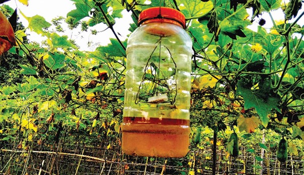 نکات مهم نصب تله: یکی از مهمترین فاکتورها در نصب تله، انتخاب محل مناسب برای آن است. در صورتی که امکانپذیر باشد، تله های فرمونی باید در مناطق جفتگیری حشره نصب شود. مگس های میوه عموماً در سایبان درختان میزبان و یا مجاورت این درختان جفتگیری میکنند که بخش های نیمسایه و خلاف جهت باد سایبان را انتخاب میکنند. تله های پروتئینی باید در نزدیکی درختان میوه در بخش شرقی درخت نصب شود. در این صورت تله باید روی میزبان اولیه (هنگام رسیدن میوه) قرار گیرد. تله ها در فاصله 5/1 تا ۲/۲ متری از سطح زمین (به ارتفاع درخت میزبان بستگی دارد) که در میانه تا بالای سایبان درخت و خلاف جهت باد نصب میشود. پیشنهاد کیمیا سبزآور: بنا به تقاضای باغداران عزیز و در جهت بهبود نیازهای اساسی کشاورزان ایرانی، شرکت کیمیا سبز آور اقدام به توید محصول مدلور نمود که با استقبال بالای شما عزیزان روبرو شد. مدلور یک ترکیب جدید حاوی نمک های آمونیوم و پروتئین هیدرولیزات است که جهت پایش جمعیت و شکار انبوه هر دو جنس نر و ماده مگس هاى ميوه به ویژه مگس میوه مدیترانه، مگس زیتون، مگس گیلاس و مگس جالیز مورد استفاده قرار مى گيرد. مزایای مدلور: - قیمت مناسب : هزینه استفاده از مدلور بسیار کمتر از پروتئین هیدرولیزات و سایر جلب کننده ها است و تا 50 درصد هزینه شما را کاهش می دهد - سازگاری با محیط زیست : مدلور برای انسان، پرندگان، آبزیان و حشرات مفید بی خطر است و در طبیعت به سادگی تجزیه و جذب خاک می شود. - پایداری : آزمایشات حاکی از دوام مایع مدلور در جلب حشرات می باشد و مایع تا حداقل 30 روز جلب کنندگی خود را حفظ می کند. در این فاصله در صورت پر شدن تله، می توان محلول را از صافی گذرانده تا حشرات جدا شوند و سپس مایع صاف شده را مجددا مورد استفاده قرار داد. روش ساخت تله خانگی برای مگس میوه مدیترانه یک بطری خالی و بدون برچسب آب معدنی یا نوشابه خانواده 5/1 لیتری برداشته و به وسیله یک میخ داغ شده یا مته ، مطابق تصویر ، چهار تا شش سوراخ ، به قطر 8 تا 10 میلی متر ، به فواصل مساوی و در امتداد محیط ، بر روی بدنه آن ایجاد کنید . ماده جلب کننده را به نسبت توصیه شده با آب رقیق کرده و پس از افزودن چند قطره مایع ظرفشوئی ، بطری را تا عمق 5 تا 10 سانتی متر با آن پر کنید. دلیل افزودن مایع ظرفشوئی به محلول، کاهش کشش سطحی آن و در نتیجه غرق شدن آسانتر حشرات است. برای تهیه ماده جلب کننده ، به جدول انتهای این پست مراجعه فرمائید . درب بطری را بسته و طبق تصویر ، بوسیله یک تکه سیم یا ریسمان آنرا از شاخه های بیرونی درخت آویزان کنید . اکنون تله شما آماده شکار می باشد . مگس ها به تدریج به سمت محلول جلب شده و از طریق سوراخ ها وارد بطری می شوند ولی قادر به یافتن راه خروج نبوده و پس از مدتی در محلول افتاده و غرق می شوند . برای کسب بهترین نتیجه ، حتما به نکات مهم زیر عمل نمائید: 1. بهتریم زمان تله گذاری: ابتدای فصل فعالیت آفت 2. تعداد تله برای درختان مرکبات کوچک و متوسط، دو تا سه عدد برای درختان بزرگ تر پنج تا شش عدد نصب بر روی شاخه های بیرونی به فاصله 5/ 1 تا 2 متر از سطح زمین و ترجیحا در سایه. 3. به ازای هر سه تله نصب شده بر روی درختان میوه، یک تله بر روی درختان غیر مثمر و یا بوته های مجاور نصب شود. 4. فاصله تله های نصب شده از یکدیگر بیش از 5 متر نباشد. 5. بهترین نتیجه از مبارزه با آفات در صورتی حاصل می شود که اقدامات پیشگیرانه به صورت جمعی و با مشارکت اکثریت کشاورزان منطقه انجام گیرد. 6. تله ها را به طور منظم بازدید نموده و در صورت خشک شدن یا فساد محلول جلب کننده و یا پر شدن تله از حشرات ، نسبت به تخلیه و جایگزینی با محلول تازه اقدام نمائید. 7. در صورت مشاهده افزایش قابل ملاحظه تعداد مگس های صید شده در تله ها، با مشورت کارشناسان جهاد کشاورزی یا کلینیک های گیاهپزشکی، نسبت به اتخاذ سایر تدابیر، اقدام نمائید. احتیاطات لازم : همیشه بر روی تله ها عبارت " احتیاط ! تله مگس مدیترانه "، به همراه تاریخ نصب را درج نموده و آنها را در محل دور از دسترس کو
